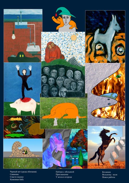 Names of works: 1. Black cat (habitat), 2. Swineherd, 3. Stone woman, 4. Landscape with a monkey, 5. Invitation, 6. At the goat in the garden, 7. Goat, 8.Freestyle, 9. Job search.