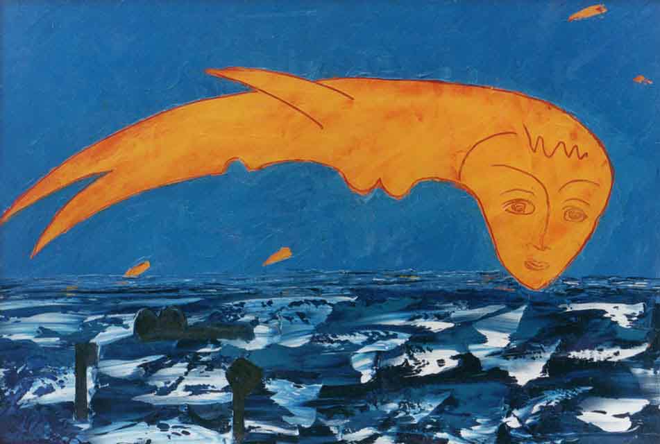 Flying Goldfish, 2001, oil/particle board, 48x69.5 cm.
