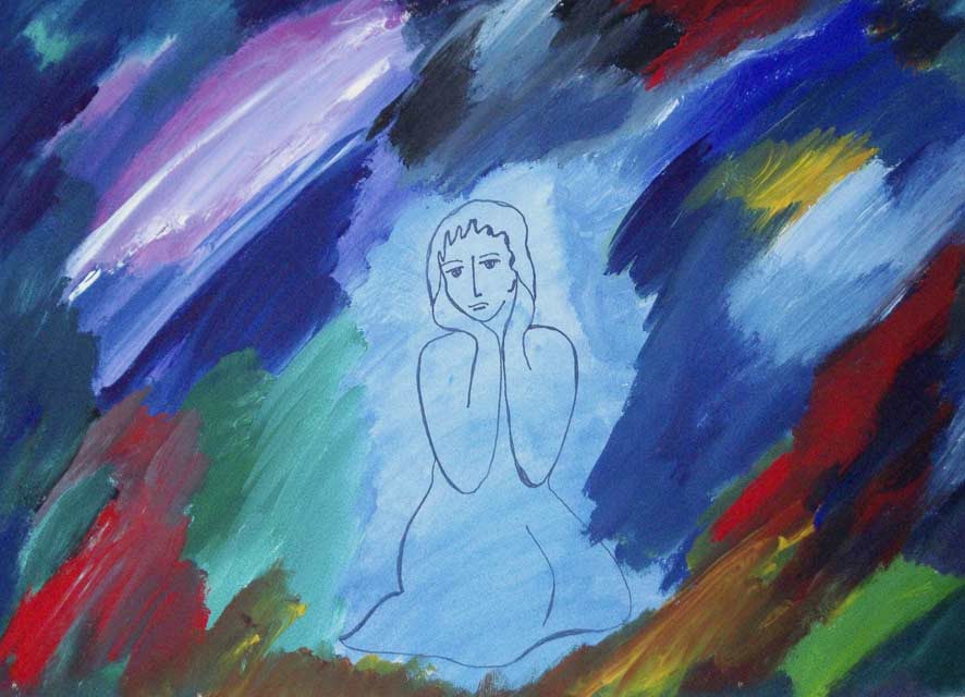 Испуганная девушка (окружающее слишком разнообразно), 2011, бумага, темпера, 38х53 см.