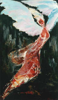 «Ника». Эмоциональный конфликт, достигший своего предела и срыва. Она дана в полете, броске, падении. По диагонали холста из левого нижнего угла в правый верхний. Растерзанная, беззастенчиво обнаженная грудь, рот, раскрытый в крике, золото волос, вставших дыбом. Весь торс, бедра, грудь подчеркнуты дополнительными контурами, передающими движение. И в каждом из намеченных положений она остается изящной.