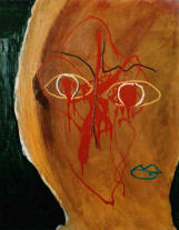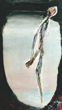 Человек одинок, хил и стоек. Он обнажен до нервных токов, до чувств, которые видимы. Нежное голубоватое место на ноге около колена, красные горячие кисти рук, горделивая грудная клетка, голова, обращенная к горизонту и за горизонт. На небе то ли облако, то ли фигура покойника. А у человека горе, боль, вина, бессилие проступили на горле продольной раной. Белое пламя охватило человека, язычком поднялось у головы. Что-то это пламя прохладно. Можно, конечно, сказать — сублимация. А может быть, наоборот — возвращение, осознание своей изначальной сути. Удивительнее всего, что пламя здесь не символ, а непосредственное переживание.