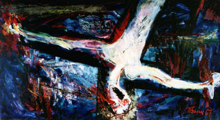 «Распятие». Изможденное светящееся тело распростерто над миром, над Вселенной, на грани с небытием. Хрупкий собственный свет не защищает его от конфронтации с реальностью креста. Лишь кое-где свет как бы выступает из тела: у шеи, немного у руки. Человек повернут головой вниз. Почему? Ну, может, подвесили, чтобы удобнее было бить ногами в лицо или плевать. А скорее всего он уже там, где нет ни верха, ни низа. Разбитые глаза, рваный черный провал рта, в котором не видно зубов, изуродованные окровавленные кисти. Кто же не представлял себе, как срывают ногти, выламывают суставы, расплющивают кости?! Фигура воспринимается тройственно. Это и Христос, распятый на кресте: на голове терновый венок, на груди у сердца — кровь. Это и просто замученный человек. Это и положение, самоощущение человека в мире. Вселенная, над которой он распят, разнообразна по цвету, хотя преобладают холодные трагические тона, причем каждый цвет отчетлив, даже когда один проглядывает из-под другого. Почти все последующие картины художника по цвету в большей или меньшей мере тяготеют к «Распятию».