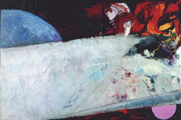 ...С разных сторон от белой полосы — две планеты. И еще кое-где редкие разноцветные огоньки. Как-то теплее оттого, что они есть. Одна планета голубоватая, пустая — видимо, Земля. Фиолетовым облачком слетает с нее последнее покрывало. Многое из того, что волновало, занимало жизнь, стало неважным навсегда. Другая — написана кобальтом фиолетовым светлым — цветом, редко встречающимся в повседневной жизни, цветом одновременно холодноватым и пламенеющим, ярким и сдержанным, насыщенным и прозрачным. Не Солнце и не Луна. Его планета. Состояние души, осветившее конец.